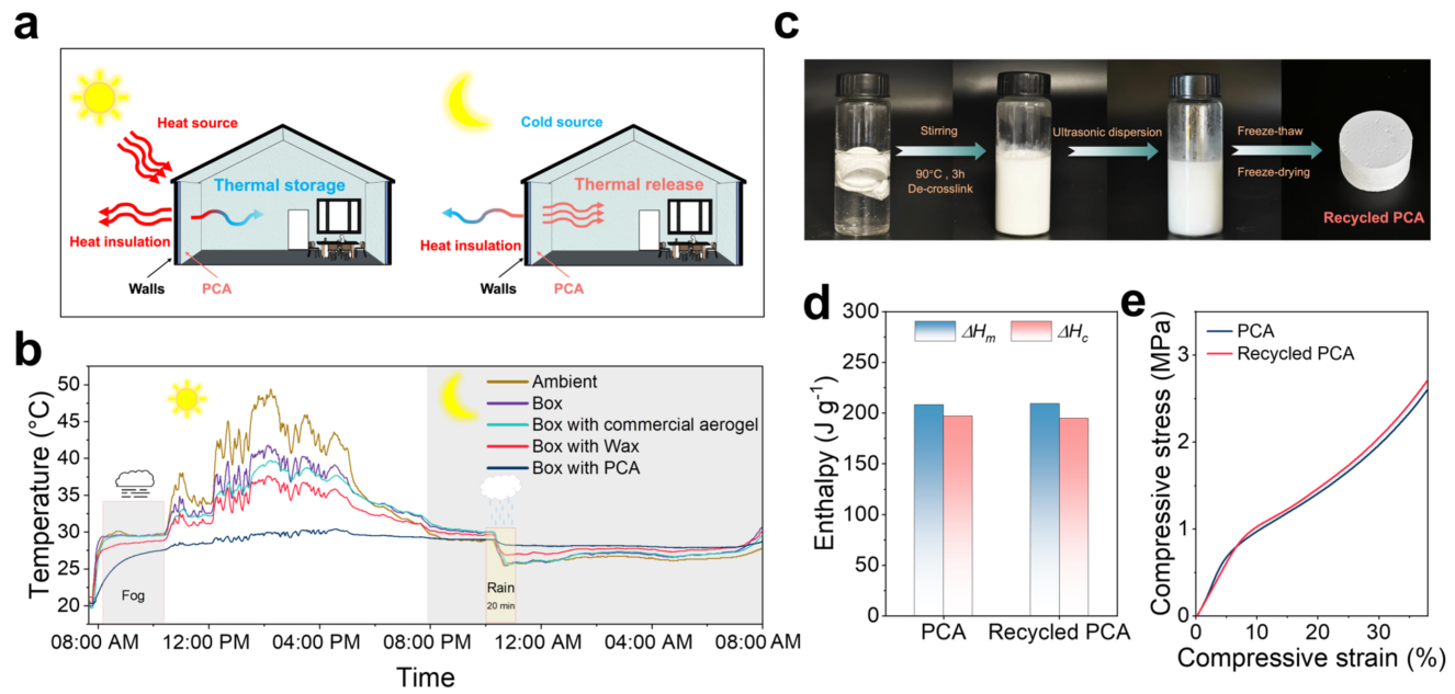 本研究模拟验证了建筑物中该新型相变气凝胶的恒温调控能力(图3)。研究发现,基于“隔热+储热”一体化机制的相变气凝胶,实现了长达24小时的接近恒温调控,效果显著优于商业气凝胶。此外,该相变气凝胶具有与蜂窝类似的可循环利用特性,为其在建筑等领域、航天热防护、冷链物流等领域可持续应用奠定了基础。